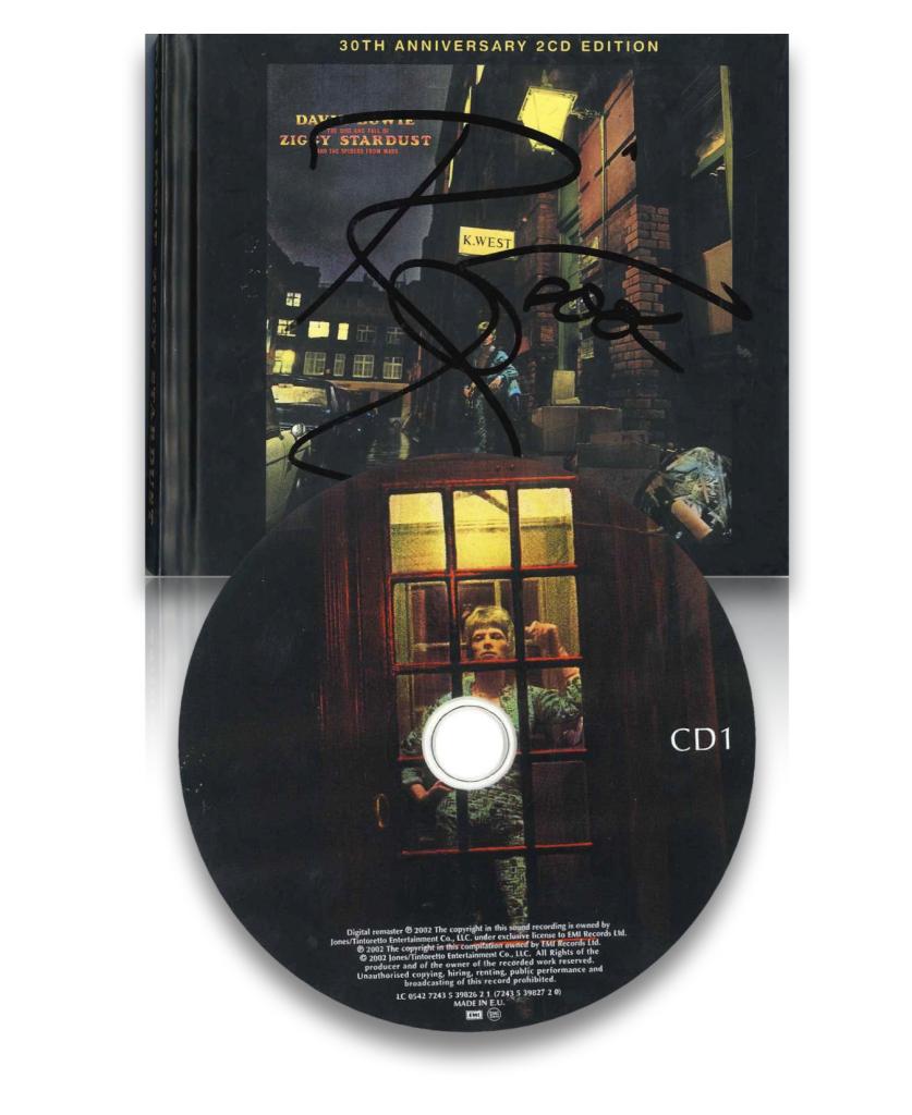 Rarissimo autografo di David Bowie su copertina del CD The Rise and Fall of Ziggy Stardust and the Spiders from Mars, nella sua pregiatissima edizione Anniversario del 2012, rimasterizzata da Emi/Parlophone in occasione del 40° anniversario dell'album.