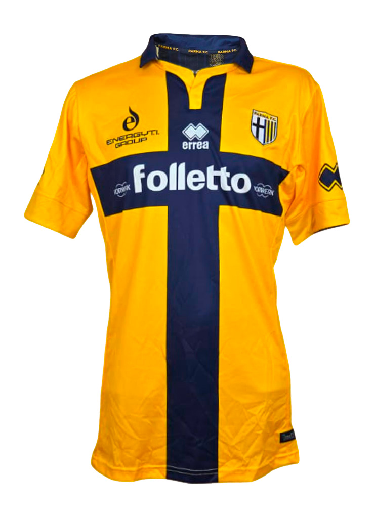 Maglia third del Parma FC utilizzata nella stagione 2014/2015, realizzata da Erreà e contraddistinta dal classico giallo crociato con ampia croce centrale blu, elemento identitario della storia del club. Il colletto è rifinito in blu con inserto frontale a V, mentre lo stemma Parma FC è applicato sul petto in versione moderna. Lo sponsor tecnico Erreà accompagna lo sponsor commerciale Folletto al centro, con Energy T.I. Group sul lato anteriore. Sulle maniche è presente la patch ufficiale Serie A TIM. Sul retro c'è la personalizzazione con nome Cassano e numero 99 in blu, con logo Parma FC integrato nei numeri e sponsor Piazza Italia nella parte bassa. Versione Store, ideale per collezionisti e appassionati della storica stagione di ritorno in Serie A.