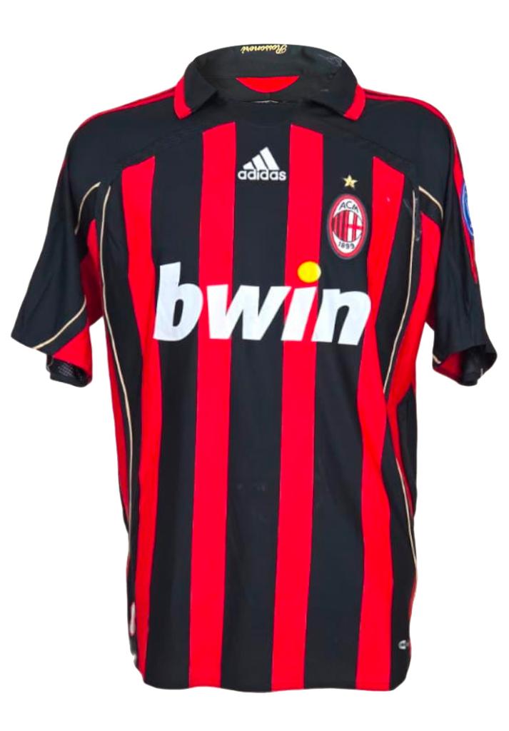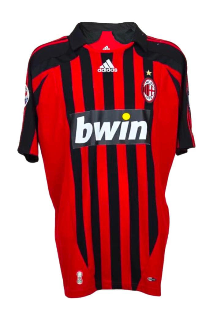 Maglia Home dell’AC Milan utilizzata nella stagione 2006/2007, realizzata da Adidas e divenuta iconica nell’annata culminata con il trionfo in Champions League. Il design presenta le tradizionali strisce verticali rosse e nere, arricchite da sottili inserti dorati che donano eleganza e carattere alla maglia. Il colletto con apertura frontale e dettagli neri richiama lo stile tecnico dell’epoca, mentre sul petto trovano spazio il logo Adidas, lo stemma Milan con stella e lo sponsor commerciale bwin. Sulle maniche sono applicate le patch ufficiali di competizione, a testimonianza del percorso europeo e del campionato di Serie A. Sul retro compaiono nome Gilardino e numero 11 in oro, con stemma Milan integrato alla base dei numeri. Una maglia di grande valore storico e collezionistico, legata a una delle stagioni più memorabili della storia rossonera. Versione Store, ideale per collezionisti e tifosi del Milan.
