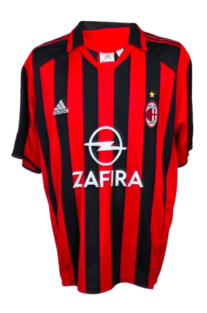 Maglia Home dell’AC Milan indossata nella stagione 2005/2006, realizzata da Adidas e caratterizzata dalle iconiche strisce verticali rossonere che rappresentano la tradizione storica del club. Il design presenta colletto a V con inserti neri e rossi e le tre strisce Adidas sulle spalle, mentre sul petto sono applicati il logo Adidas, lo stemma Milan con stella e lo sponsor commerciale Zafira. Il tessuto ClimaCool garantisce leggerezza e traspirabilità, tipiche delle versioni Store dell’epoca. Sulle maniche è presente la patch ufficiale Serie A, a testimonianza dell’utilizzo nel campionato italiano. Sul retro compaiono nome Shevchenko e numero 7 in oro, con stemma Milan integrato alla base del numero. Maglia legata a uno dei simboli assoluti della storia rossonera, dal forte valore collezionistico.