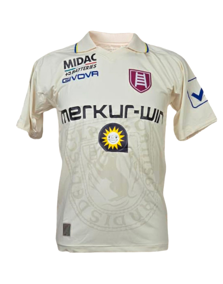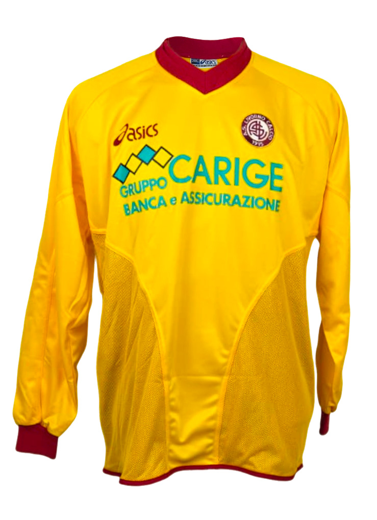 Maglia del Livorno utilizzata nella stagione 2004/2005, realizzata da Asics e contraddistinta da un design riconoscibile e funzionale, pensato per garantire comfort e traspirabilità. Il colore giallo acceso è arricchito da inserti in mesh laterali e dettagli amaranto su colletto, polsini e finiture, richiamando i colori storici del club. Sul petto trovano spazio il logo Asics, lo stemma dell’AS Livorno Calcio e lo sponsor commerciale Gruppo Carige Banca e Assicurazione. Il colletto a V e la struttura del tessuto riflettono lo stile tecnico dei primi anni Duemila. Sul retro sono applicati nome Protti e numero 10 in amaranto, omaggio al capitano e simbolo assoluto della storia amaranto. Versione Store, dal forte valore affettivo e collezionistico per tifosi e appassionati del Livorno Calcio.