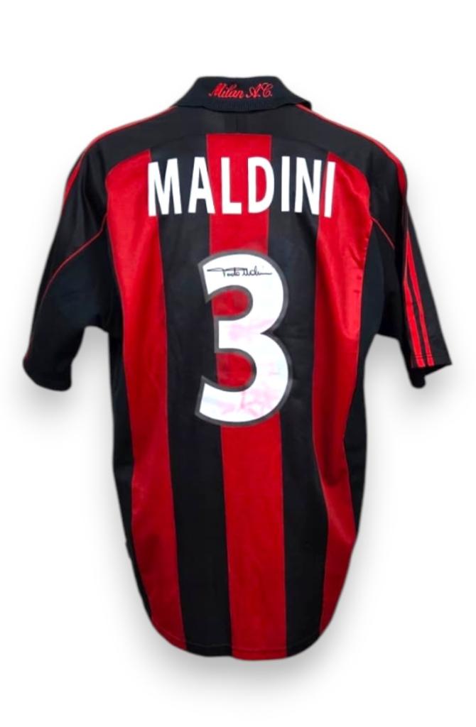 Maglia Home dell’AC Milan della stagione 2000/2001, autografata da Paolo Maldini, realizzata da Adidas e simbolo della tradizione rossonera a cavallo tra due epoche storiche del club. Il design presenta le classiche strisce verticali rosse e nere, abbinate al colletto a V con finiture nere e alle tre strisce Adidas sulle spalle. Sul petto sono applicati il logo Adidas, lo stemma Milan con stella e lo storico sponsor commerciale Opel. Il tessuto tecnico dell’epoca garantisce comfort e vestibilità regolare, tipica delle versioni Store. Sul retro compaiono nome Maldini e numero 3 in bianco, impreziositi dalla firma autografa di Paolo Maldini apposta sul numero, elemento che rende la maglia un pezzo di assoluto rilievo collezionistico. Una maglia iconica legata al capitano simbolo della storia rossonera, dal valore storico ed emozionale elevatissimo per ogni appassionato del Milan.