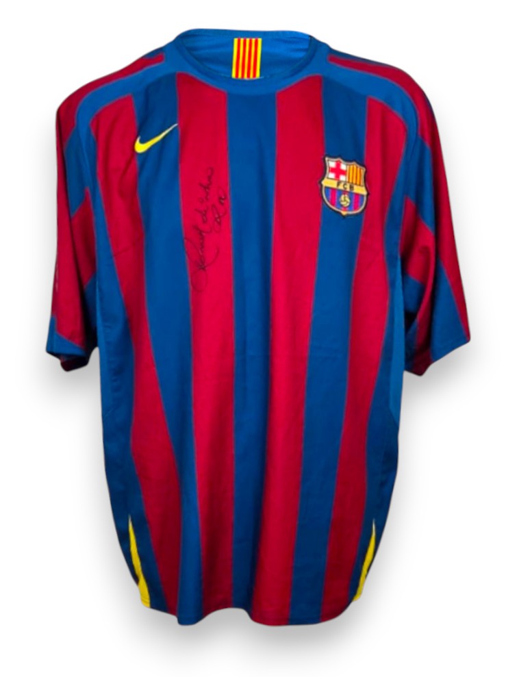Maglia Home del FC Barcellona della stagione 2004/2005, autografata da Ronaldinho realizzata da Nike e divenuta una delle più iconiche dell’era moderna blaugrana. Il design presenta le classiche strisce verticali blu e granata, abbinate al colletto a girocollo con dettaglio centrale della senyera catalana, simbolo identitario del club. Sul petto sono applicati lo swoosh Nike e lo stemma ufficiale del FC Barcelona, mentre sulla manica compare la patch LFP della Liga spagnola. Il tessuto tecnico garantisce leggerezza e comfort, tipici delle versioni Store dell’epoca. Sul retro compaiono nome Ronaldinho e numero 10 in giallo, mentre sul fronte è presente la firma autografa del campione brasiliano, elemento che rende la maglia un pezzo di assoluto prestigio collezionistico. Una maglia legata alla stagione del ritorno al vertice del Barcellona e al talento puro di uno dei giocatori più amati della storia del calcio.