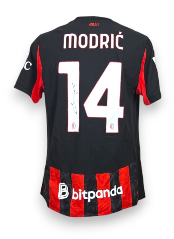 Maglia Home dell’AC Milan della stagione 2025/2026, autografata da Modric e realizzata da Puma, caratterizzata da un design moderno che reinterpreta le iconiche strisce rossonere con una grafica tono su tono che aggiunge profondità e dinamismo al tessuto. Il corpo principale alterna rosso e nero, con colletto a girocollo nero e dettagli rossi sulle maniche. Sul petto sono presenti il logo Puma, lo stemma ufficiale dell’AC Milan con stella celebrativa e lo sponsor commerciale Emirates Fly Better, mentre sul retro compare lo sponsor Bitpanda nella parte inferiore. La maglia è personalizzata con nome Modri? e numero 14 in bianco, ed è impreziosita dalla firma autografa del calciatore sul numero, elemento che ne accresce notevolmente il valore collezionistico. Completano il quadro le patch ufficiali Serie A e gli inserti tecnici che garantiscono comfort e traspirabilità. Un pezzo esclusivo e altamente rappresentativo di una stagione storica, ideale per collezionisti e appassionati del mondo rossonero.