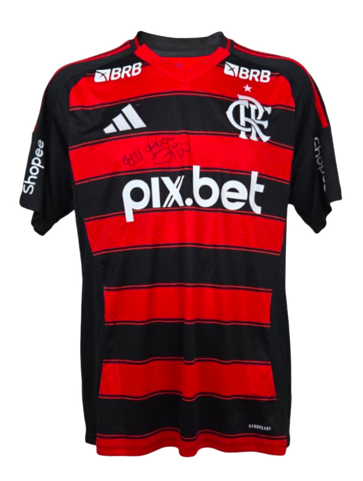 Maglia Home del Flamengo autografata da Zico, caratterizzata dal classico design a bande orizzontali rosso e nere che rappresenta l’identità storica del club brasiliano. Il modello presenta scollo a V, crest ufficiale del Flamengo sul petto e sponsor tecnico Adidas, con sponsor commerciale PixBet applicato frontalmente. Sul retro sono presenti nome Zico e numero 10, elemento simbolo della leggenda carioca, accompagnati dalla firma originale che ne accresce in modo significativo il valore collezionistico. Tessuto tecnico leggero e traspirante, pensato per l’uso sportivo, con dettagli moderni integrati in uno stile fortemente evocativo. Un pezzo di grande prestigio dedicato a uno dei più grandi numeri dieci della storia del calcio.
