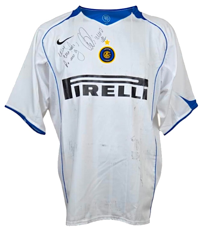 Maglia away dell’Inter della stagione 2004-2005, autografata da Adriano, elemento che ne accresce in modo significativo il valore collezionistico. Il design Away si distingue per la base bianca arricchita da inserti blu sulle spalle e lungo i fianchi, con scollo a V e linee pulite tipiche dell’epoca. Sul petto trovano spazio lo sponsor tecnico Nike, il crest dell’Inter con stella e lo sponsor commerciale Pirelli, simbolo di un ciclo storico del club. Sul retro sono applicati nome Adriano e numero 10, accompagnati dalla firma originale ben visibile, dettaglio che rende il capo particolarmente ricercato. Tessuto tecnico leggero e traspirante, pensato per la competizione, in una maglia che richiama gli anni d’oro dell’Imperatore in nerazzurro. Un pezzo di grande fascino per collezionisti e appassionati interisti.