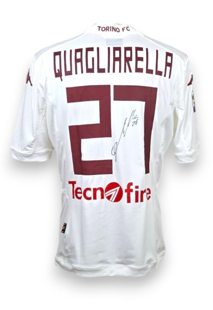 Maglia del Torino FC stagione 2018-2019, autografata da Quagliarella, versione Player Issued, destinata al campo e caratterizzata da vestibilità aderente e materiali tecnici ad alte prestazioni. Il design si distingue per la colorazione bianca con dettagli granata, colletto a V e stemma ufficiale del club sul petto, accompagnato dagli sponsor Suzuki Vitara e Fratelli Beretta. Sul retro sono presenti nome e numero 27 Quagliarella, con patch ufficiale Serie A applicata sulla manica. La maglia è arricchita dalla firma originale di Fabio Quagliarella, rendendo la maglia un pezzo di grande valore collezionistico, legato a una delle stagioni più significative della sua esperienza in granata.