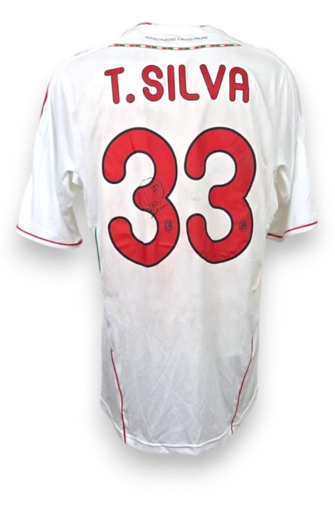 Maglia Away del Milan stagione 2011-2012, autografata da Thiago Silva, realizzata da adidas per le competizioni ufficiali di Serie A. La divisa presenta la classica base bianca con dettagli rossoneri verticali sul fronte, crest AC Milan con stella e Scudetto tricolore applicato sul petto, sponsor commerciale Fly Emirates e sponsor tecnico adidas. Il nameset T. Silva con numero 33 è applicato sul retro ed è accompagnato da firma originale del calciatore, elemento che accresce in modo significativo il valore collezionistico del capo. Versione Player Issued, caratterizzata da materiali tecnici Formotion e vestibilità professionale, identica a quella preparata per il difensore brasiliano durante la sua ultima stagione in rossonero.