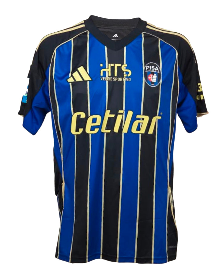 Maglia Home del Pisa per la stagione 2025-2026, utilizzata nelle competizioni di Serie A e appartenente alla versione Player Issued. Il design richiama la tradizione del club con base nera attraversata da sottili righe verticali blu, arricchite da dettagli dorati che valorizzano l’estetica tecnica del capo. Lo sponsor tecnico Adidas firma la maglia con una costruzione studiata per l’uso professionale, mentre gli sponsor commerciali Cetilar e iTS – Verde Sportivo sono applicati sul fronte. Sul petto è presente lo stemma del Pisa Sporting Club, mentre sul retro compaiono nome e numero 94 di Bonfanti, applicati in stile ufficiale da gara. Un capo autentico e di grande fascino collezionistico, rappresentativo di una stagione storica per il club e pensato per il massimo livello del calcio italiano.