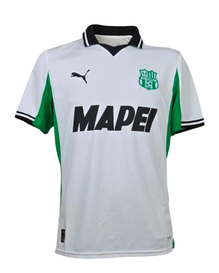 Maglia Away del Sassuolo stagione 2025-2026, utilizzata nella competizione di Serie A e personalizzata con Laurienté 45. Il design presenta la classica base bianca con inserti verdi e neri sui fianchi, colletto a polo con profili a contrasto e finiture curate che richiamano lo stile tecnico del club emiliano. Sul petto sono applicati lo sponsor tecnico Puma e lo sponsor commerciale Mapei, accompagnati dallo stemma ufficiale del Sassuolo. Il nameset Laurienté con numero 45 è applicato sul retro in stile gara, con patch Serie A sulla manica. La versione Player Issued si distingue per la costruzione professionale e i materiali performanti, pensati per l’utilizzo in campo ai massimi livelli.