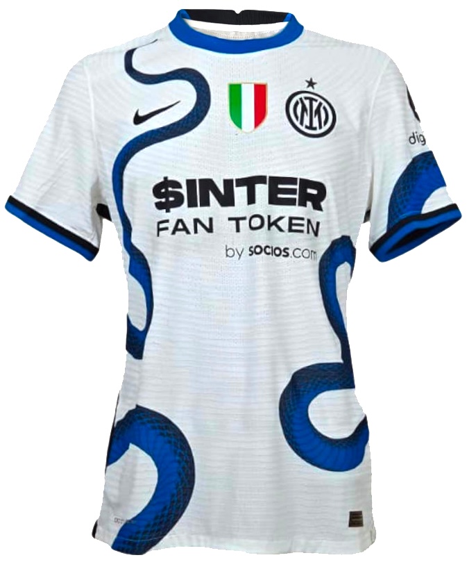 Maglia away dell’Inter della stagione 2021-2022 player issued, realizzata da Nike e utilizzata nella competizione di Serie A. Il design bianco è impreziosito dal celebre motivo grafico a serpente in tonalità blu e nere, elemento distintivo di questa annata, con scudetto tricolore applicato sul petto e stella celebrativa sopra lo stemma nerazzurro. Lo sponsor principale $INTER Fan Token by Socios.com è presente frontalmente, mentre Lenovo compare nella parte bassa posteriore. Sul retro sono applicati nome e numero Džeko 9, con caratteristiche tecniche proprie della versione Player Issued, pensata per l’utilizzo professionale. Una maglia iconica, rappresentativa dell’Inter campione d’Italia in carica e di una stagione di alto livello del centravanti bosniaco.