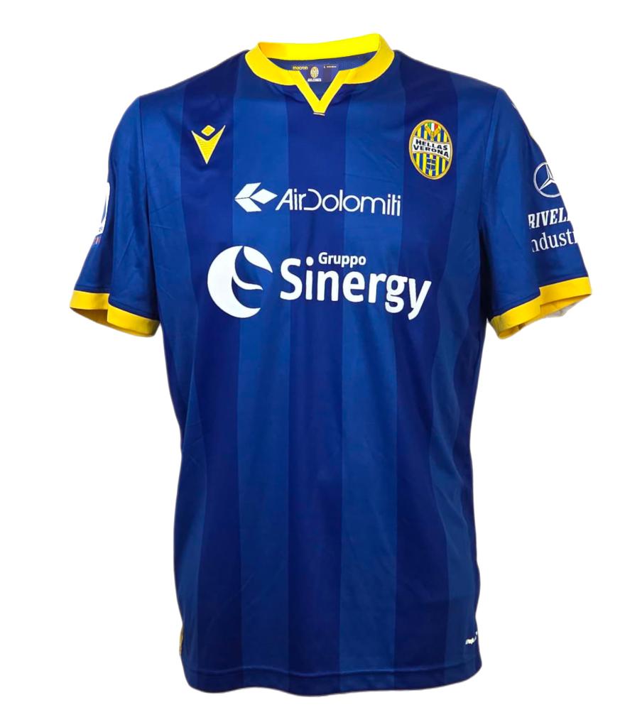 Maglia Home dell’Hellas Verona relativa alla stagione 2019-2020 player issued con patch di Serie A, realizzata da Macron per le versioni destinate al campo. Il classico design blu è arricchito da sottili bande verticali tono su tono e dettagli gialli su colletto e maniche, che richiamano la tradizione del club scaligero. Sul petto sono presenti lo stemma Hellas Verona, il logo Macron e lo sponsor principale, mentre sul retro spiccano il nome Udogie e il numero 39 in stile ufficiale Serie A, accompagnati dallo sponsor posteriore. La maglia presenta materiali tecnici e una vestibilità professionale, tipici delle versioni Player Issued, ed è un capo rappresentativo dell’esordio di Udogie nel massimo campionato italiano, rendendola un oggetto di forte interesse collezionistico.
