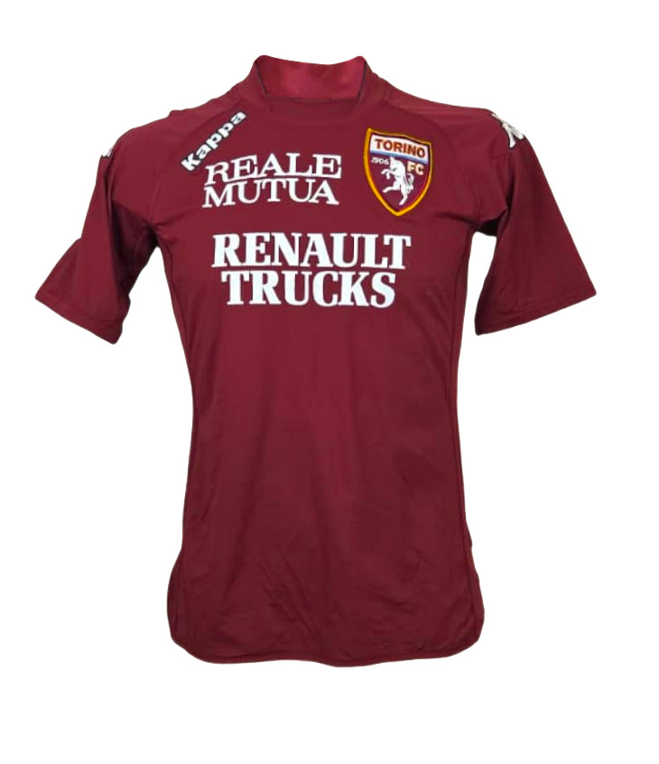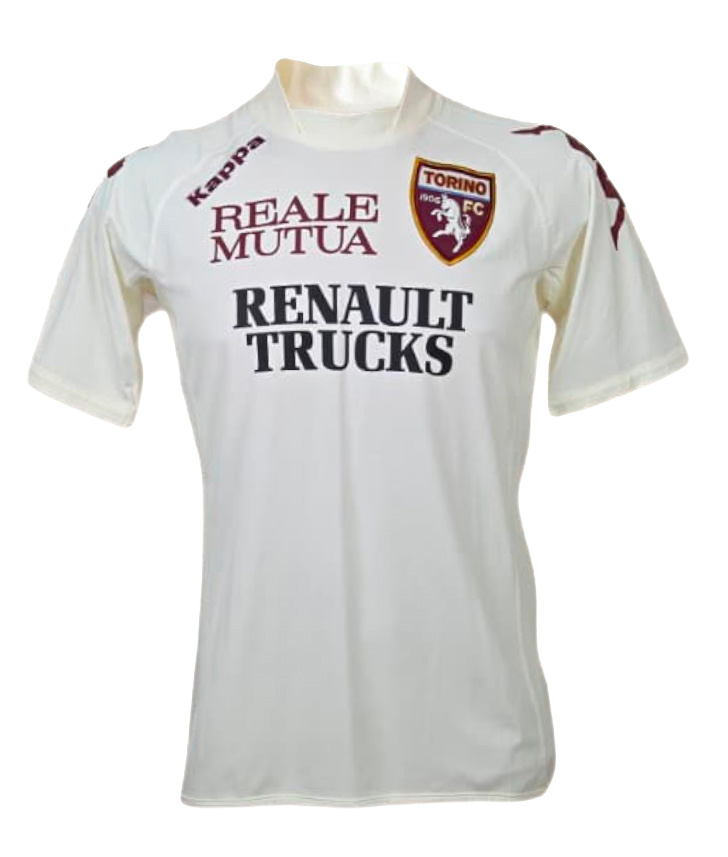 Seconda maglia del Torino FC per la stagione 2008-2009, player issued indossata da Eugenio Corini nel campionato di Serie A. Il design si distingue per la colorazione chiara avorio, impreziosita da dettagli granata che richiamano l’identità storica del club. Lo sponsor tecnico Kappa firma il capo con una vestibilità aderente tipica della versione Player Issued, pensata per l’utilizzo in campo. Sul fronte sono presenti gli sponsor Reale Mutua e Renault Trucks, applicati in stampa ufficiale, mentre sul petto spicca lo stemma del Torino FC. Sul retro compaiono il nome Corini e il numero 5, accompagnati dalla patch ufficiale della Serie A sulla manica. Una maglia di grande fascino collezionistico, legata a una stagione significativa della storia recente granata e a uno dei suoi protagonisti più rappresentativi.
