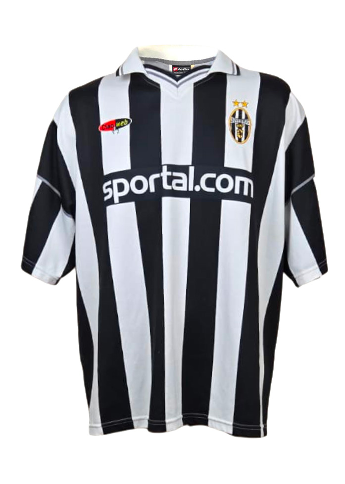 Maglia Home della Juventus relativa alla stagione 2000-2001, player issued realizzata per le competizioni di Champions League. Il design iconico a strisce verticali bianconere è arricchito dal colletto a V con rifiniture a contrasto, dallo stemma Juventus con le due stelle e dallo sponsor tecnico Lotto. Sul fronte è presente lo sponsor commerciale sportal.com, mentre sulle maniche compaiono le patch ufficiali UEFA Champions League. Il retro è personalizzato con il nameset Zambrotta e il numero 23, applicati in stile ufficiale dell’epoca. Un capo autentico e rappresentativo di una stagione europea della Juventus, pensato per l’uso professionale in campo e oggi molto ricercato dai collezionisti.