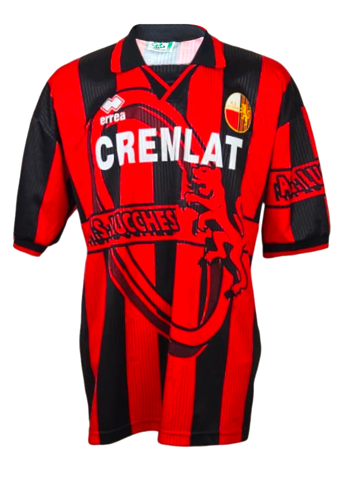 Maglia Lucchese Home stagione 1996-1997, player issued utilizzata nella competizione di Serie B, destinata all’uso diretto in campo. Il design presenta le classiche strisce verticali rossonere arricchite da una grafica aggressiva con il leone simbolo del club integrato frontalmente, elemento distintivo delle divise Erreà di metà anni Novanta. Sul petto compaiono il logo tecnico Erreà, lo stemma societario e lo sponsor commerciale Cremlat, mentre sulle maniche sono presenti ulteriori dettagli grafici e patch di lega dell’epoca. Il retro è personalizzato con il nome Barone e il numero 10 in grande formato, completando una maglia fortemente rappresentativa di un periodo storico del calcio italiano, apprezzata per carattere, impatto visivo e valore collezionistico.