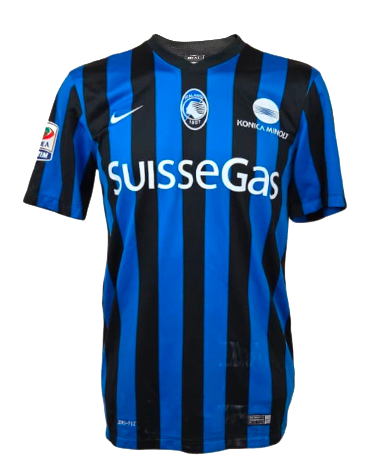 Maglia Atalanta Home utilizzata nella stagione 2014-2015, player issued caratterizzata dalle iconiche strisce verticali nerazzurre che rappresentano la tradizione del club bergamasco. Il design presenta lo scudo Atalanta sul petto, lo swoosh Nike e gli sponsor ufficiali SuisseGas e Konica Minolta, applicati secondo gli standard da gara. Il colletto a V e il tessuto tecnico Dri-FIT garantiscono vestibilità aderente e prestazioni elevate, tipiche delle forniture destinate al campo. Sul retro sono presenti il nameset MIGLIACCIO e il numero 8 in stampa ufficiale, con patch Serie A applicata sulla manica. Versione Player Issued, pensata per l’utilizzo professionale, rappresenta un autentico pezzo legato alla Serie A e alla stagione dell’Atalanta 2014-2015.