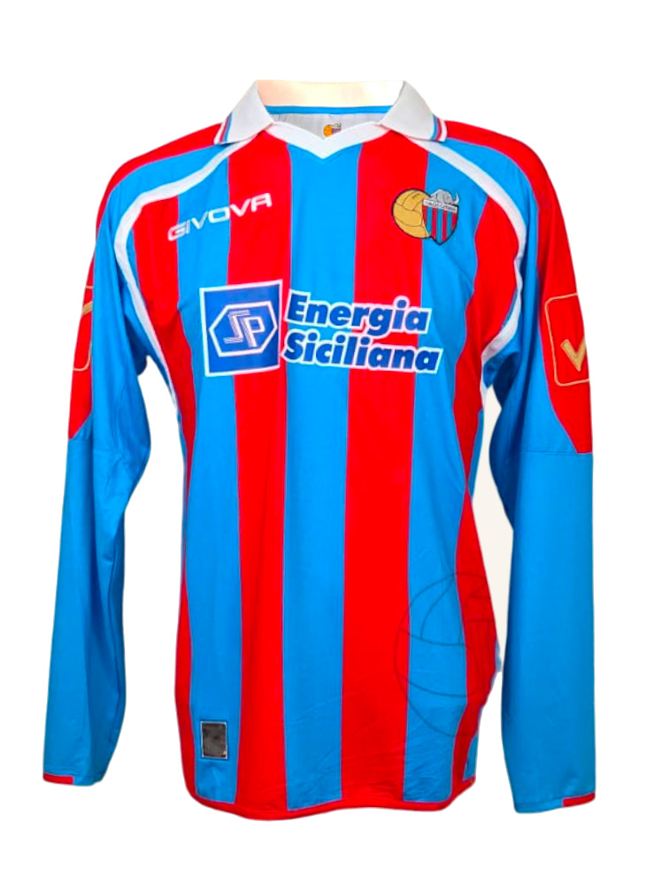 Maglia Home del Catania utilizzata nella stagione 2010-2011 versione player issued, realizzata dallo sponsor tecnico Givova. Il design classico a bande verticali rossazzurre è valorizzato dal colletto bianco con rifiniture tricolori e dai pannelli sagomati sulle maniche lunghe, elementi distintivi della versione da gara. Sul fronte spiccano lo stemma del Calcio Catania e lo sponsor commerciale Energia Siciliana, mentre il retro presenta la personalizzazione ufficiale Izco con il numero 13. La patch Serie A TIM applicata sulla manica completa una maglia Player Issued autentica, pensata per l’utilizzo professionale in campo e particolarmente apprezzata dai collezionisti.