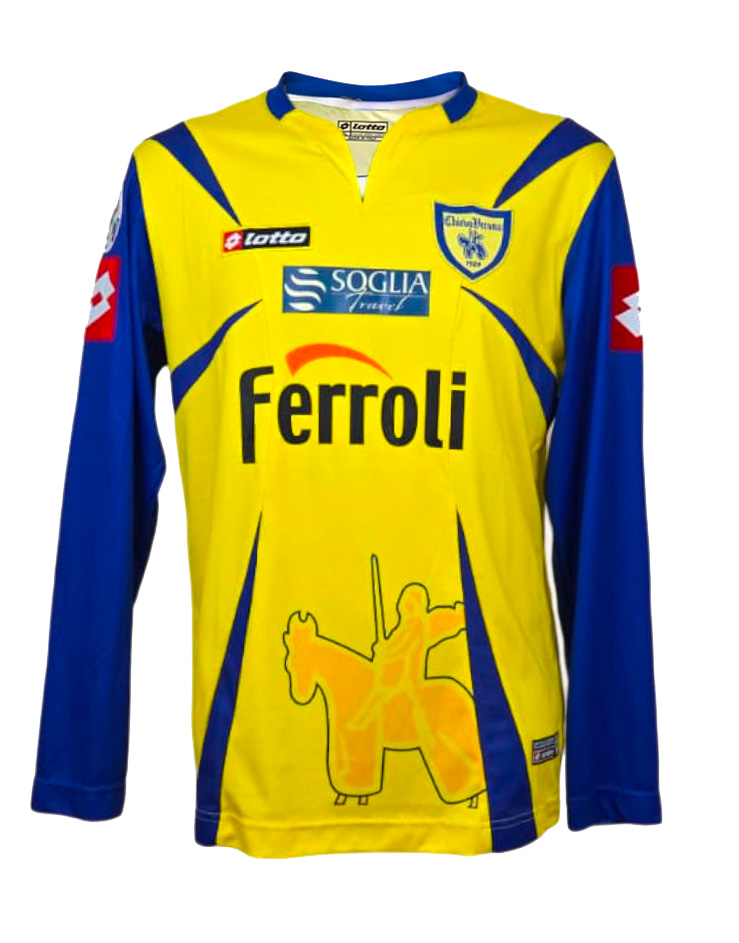Maglia Chievo Verona Home stagione 2006-2007, utilizzata nella competizione di Serie A e realizzata dallo sponsor tecnico Lotto in versione Player Issued. Il design presenta la storica base gialla con inserti blu sulle maniche e sui fianchi, valorizzata dal colletto a V con finiture coordinate. Sul petto trovano spazio lo stemma del Chievo Verona e lo sponsor commerciale Ferroli, accompagnato dal secondo sponsor Soglia Travel, mentre il logo Lotto completa l’estetica frontale. Sul retro è applicato il nameset OBINNA con numero 15 in stampa ufficiale, insieme alla patch Serie A sulla manica. Vestibilità professionale e materiali tecnici dedicati all’utilizzo in campo rendono questo esemplare un autentico pezzo da collezione della storica stagione dei gialloblù.