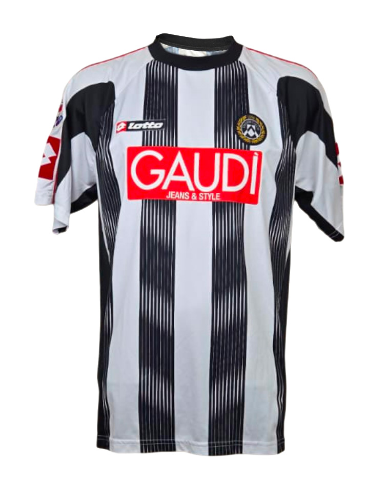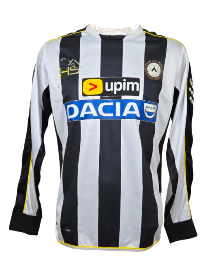Maglia Home dell’Udinese Calcio per la stagione 2007-2008, player issued utilizzata nel campionato di Serie A e realizzata dallo sponsor tecnico Lotto. Il design ripropone le iconiche strisce verticali bianconere con una grafica moderna a righe sottili sfumate, abbinate a dettagli neri su colletto e maniche. Sul petto sono applicati lo stemma ufficiale del club con corona celebrativa, il logo Lotto e lo sponsor commerciale Gaudì Jeans & Style. Sul retro è presente il nameset OBODO con il numero 5, accompagnato dalla patch Serie A TIM sulla manica, elemento distintivo delle gare ufficiali. Versione Player Issued, caratterizzata da vestibilità e materiali tecnici pensati per l’utilizzo professionale in campo, rappresenta un capo autentico e significativo della storia recente dell’Udinese.