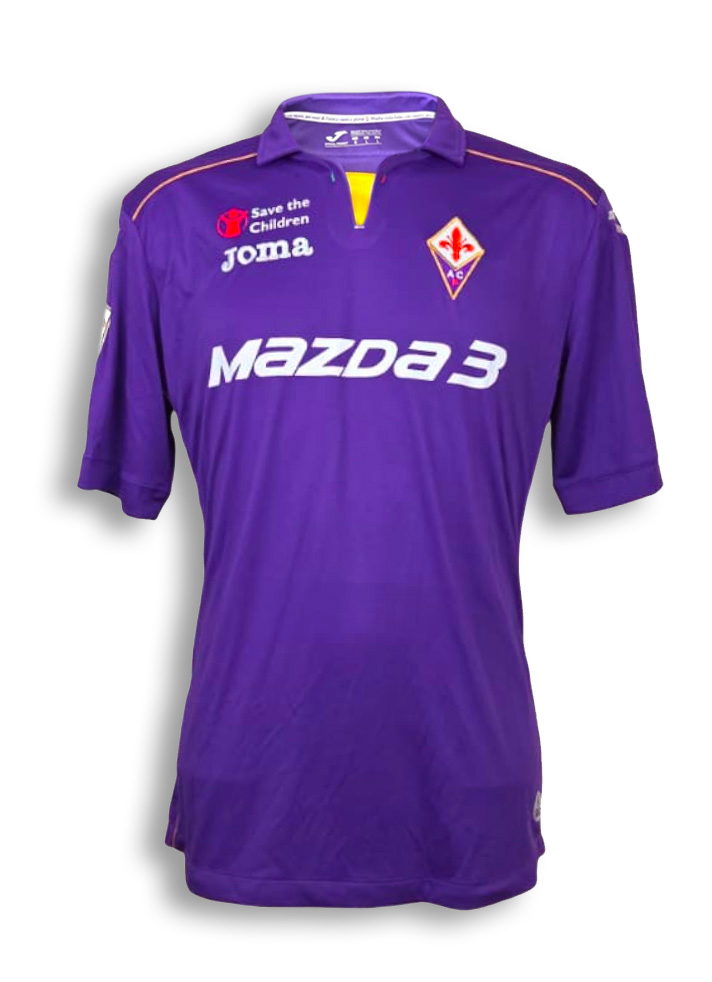 Maglia Home della Fiorentina indossata nella stagione 2013-2014, player issued, realizzata dallo sponsor tecnico Joma e caratterizzata dal classico viola intenso che identifica il club toscano. Il design presenta colletto con apertura a V, dettagli rifiniti lungo le spalle e una vestibilità aderente tipica delle versioni Player Issued. Sul fronte sono applicati lo stemma ufficiale della Fiorentina, il logo Joma e gli sponsor commerciali Save the Children e Mazda3, mentre sulle maniche è presente la patch ufficiale della Serie A. Sul retro compaiono il nameset Rossi e il numero 49, simbolo iconico del capitano e bomber viola, con stampa professionale conforme agli standard da gara. Un capo autentico e altamente collezionabile, rappresentativo di una stagione significativa della Fiorentina e della carriera di Giuseppe Rossi.