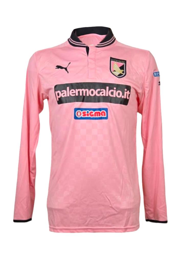 Maglia Home del Palermo utilizzata nella stagione 2013-2014, campionato di Serie B, nella versione Player Issued a manica lunga dedicata ad Abel Hernández. Il classico rosa caratterizza un design pulito ed elegante, arricchito dal colletto con inserto scuro e dettagli a contrasto che richiamano l’identità storica del club. Lo stemma dell’U.S. Città di Palermo è applicato sul petto insieme allo sponsor tecnico Puma, mentre sul fronte spiccano gli sponsor commerciali palermocalcio.it e Sigma. Sul retro sono presenti nameset Abel H. e numero 11 in stile ufficiale, con ulteriori sponsor e patch di competizione sulle maniche. La versione Player Issued si distingue per vestibilità atletica e materiali tecnici professionali, rendendo questo capo un pezzo di grande valore per collezionisti e appassionati del Palermo.