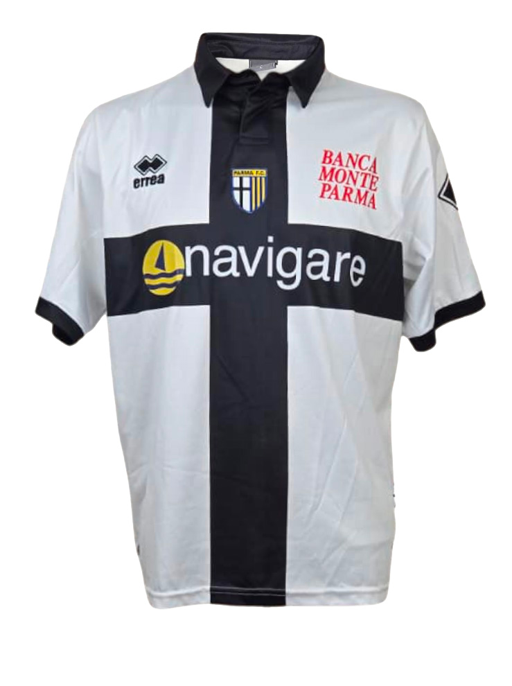 Maglia Parma Away della stagione 2009-2010, indossata nelle gare di Serie A e realizzata dallo sponsor tecnico Erreà in versione Player Issued. Il design è caratterizzato dal classico fondo bianco attraversato dalla storica croce nera sul petto, simbolo identitario del club, con colletto e dettagli coordinati. Sul fronte sono presenti gli sponsor commerciali Navigare e Banca Monte Parma, mentre sul petto campeggia lo stemma del Parma FC. Sul retro figurano il nome Lucarelli e il numero 6 in stampa ufficiale, con patch Serie A applicata sulla manica. Una maglia di grande valore storico, legata a uno dei capitani più rappresentativi della storia recente del Parma.