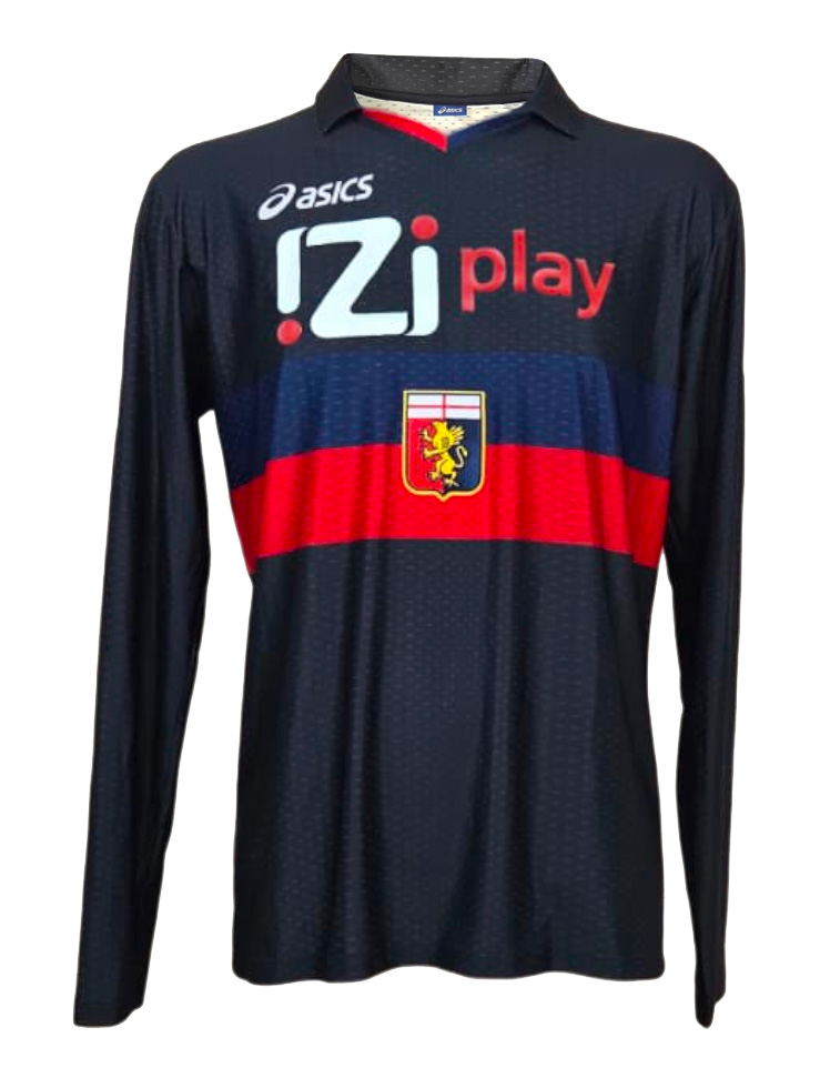 Maglia Portiere del Genoa utilizzata nella stagione 2011-2012 player issued , realizzata da Asics per il campionato di Serie A. Il design si distingue per la base scura con fascia orizzontale rosso-blu sul petto, arricchita dal crest del club e dallo sponsor tecnico Asics, affiancati dallo sponsor commerciale ZiPlay. Il colletto classico con apertura a V richiama uno stile elegante e funzionale, mentre il tessuto tecnico leggero è studiato per le esigenze del ruolo. Sul retro sono presenti il nameset Frey e il numero 1 in stampa ufficiale, con patch Serie A applicata sulla manica. Versione Player Issued, destinata all’utilizzo diretto in campo, rappresenta un pezzo autentico legato a una delle stagioni del portiere francese con il Genoa.