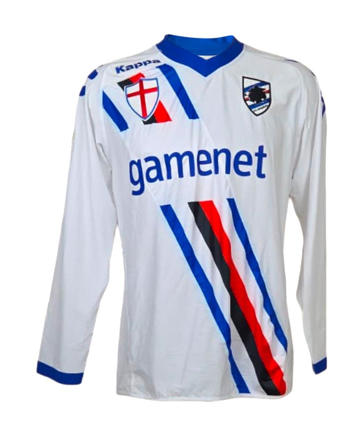 Maglia Sampdoria Away stagione 2011-2012, versione Player Issued preparata per Giampaolo Pazzini e utilizzata nella competizione di Serie A. La divisa presenta la classica base bianca con iconica banda diagonale blucerchiata che attraversa il fronte, elemento distintivo della tradizione doriana. Sponsor tecnico Kappa con loghi applicati, sponsor commerciale Gamenet centrale, stemma Sampdoria lato cuore e dettagli cromatici blu sul colletto e sui polsini. Sul retro sono applicati nameset Pazzini e numero 10 in stile ufficiale di campionato, con patch Serie A sulla manica. Realizzata con materiali tecnici e vestibilità aderente, questa versione Player Issued rappresenta una testimonianza autentica della Sampdoria dei primi anni 2010.