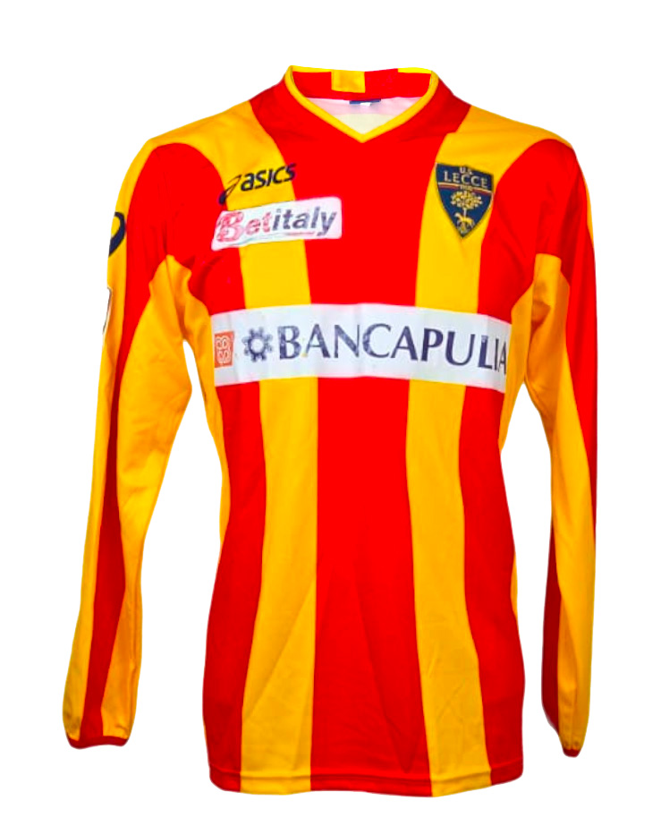 Maglia Home del Lecce per la stagione 2010-2011, player issued utilizzata nelle gare di Serie A e realizzata dallo sponsor tecnico Asics. Il design presenta le tradizionali e vivaci strisce verticali gialle e rosse, simbolo storico del club salentino, abbinate al colletto a V che richiama uno stile classico e aggressivo. Sul fronte compaiono gli sponsor commerciali BetItaly e BancApulia, mentre sul retro è applicato il nameset ufficiale Corvia con il numero 9. La maglia è una Player Issued, pensata per l’utilizzo professionale in campo, con vestibilità aderente e materiali tecnici leggeri. Completano il capo la patch Serie A sulla manica e lo stemma ufficiale del Lecce, rendendo questo esemplare un autentico pezzo da collezione legato a una stagione significativa nella massima serie.