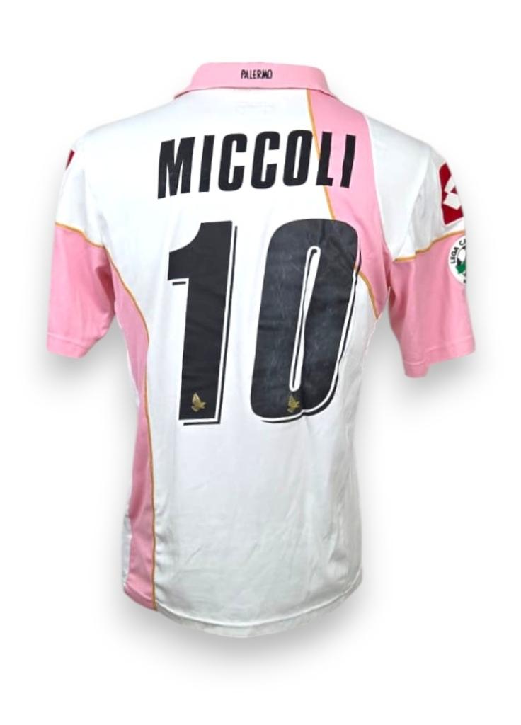 Maglia Away del Palermo relativa alla stagione 2009-2010, impiegata nelle gare di Serie A e realizzata dallo sponsor tecnico Lotto in versione Player Issued. Il design si distingue per la base bianca arricchita da pannelli rosa con profili dorati, richiamo elegante ai colori storici del club. Sul petto sono applicati il crest ufficiale U.S. Città di Palermo e il logo Lotto, mentre sulle maniche è presente la patch ufficiale della Serie A. Sul retro compaiono nome Miccoli e numero 10, elementi iconici legati al capitano e simbolo di quella stagione. La vestibilità e i materiali tecnici rispecchiano le specifiche destinate ai calciatori, rendendo il capo un pezzo di alto profilo collezionistico e sportivo.