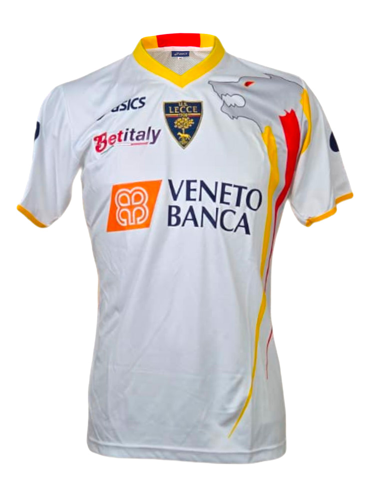 Maglia Away del Lecce utilizzata nella stagione 2010-2011, relativa alla competizione Serie A e preparata in versione Player Issued per Ernesto Javier Chevantón. La divisa si presenta nel classico colore bianco, arricchito da inserti giallorossi e dal caratteristico elemento grafico laterale con il lupo stilizzato, simbolo distintivo del club. Lo sponsor tecnico Asics e lo sponsor commerciale Veneto Banca sono applicati sul fronte insieme al crest ufficiale dell’U.S. Lecce, mentre sulla manica è presente la patch Serie A. Sul retro compaiono nome e numero 23 in stile ufficiale, completando una maglia dal taglio professionale, pensata per l’utilizzo in campo e rappresentativa di una delle stagioni più iconiche del Lecce nel massimo campionato italiano.