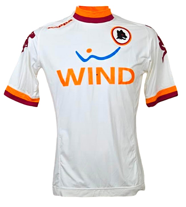 Maglia Away dell’AS Roma per la stagione 2012-2013, indossata da Daniele De Rossi nel campionato di Serie A e realizzata dallo sponsor tecnico Kappa in versione Player Issued. Il design presenta una base bianca pulita ed elegante, valorizzata da dettagli giallorossi su colletto e maniche, con il logo societario applicato sul petto e lo sponsor commerciale WIND in evidenza al centro. Sul retro sono presenti nome e numero 16 di De Rossi, applicati in stile ufficiale, mentre sulla manica compare la patch Serie A. La vestibilità aderente, i materiali tecnici e le finiture professionali distinguono questa versione da campo, pensata per l’utilizzo diretto dai calciatori e rappresentativa di una delle stagioni simbolo del centrocampista romano.
