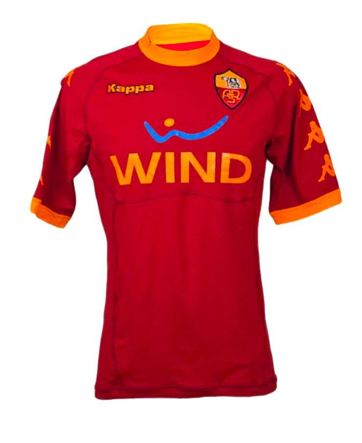 Maglia Home dell’AS Roma per la stagione 2010/2011, player issued impiegata nella competizione di Serie A e realizzata dallo sponsor tecnico Kappa. Il design presenta il classico colore rosso con dettagli gialli su colletto e maniche, arricchito dalla grafica Kappa ripetuta sulle spalle. Sul petto sono applicati lo stemma ufficiale del club e lo sponsor commerciale WIND, mentre sul retro compaiono il nameset SIMPLICIO e il numero 30 in stampa ufficiale. La patch Serie A è applicata sulla manica, a conferma dell’utilizzo nel campionato italiano. Versione Player Issued, caratterizzata da vestibilità professionale, materiali tecnici e finiture curate, identica a quella destinata ai calciatori per l’uso in campo.