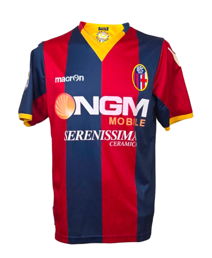 Maglia Home del Bologna FC per la stagione 2011-2012, indossata in Serie A e realizzata da Macron in versione Player Issued. Il design presenta le classiche bande verticali rossoblù, arricchite dal colletto a V giallo a contrasto e da dettagli tecnici pensati per l’utilizzo in campo. Sul petto compaiono lo stemma ufficiale del club e lo sponsor principale NGM Mobile, affiancato dalla dicitura Serenissima Ceramica, mentre sulle maniche è applicata la patch ufficiale Serie A. Sul retro è presente il nameset Diamanti con il numero 23, elemento iconico di una stagione che ha visto il fantasista come leader tecnico della squadra. Un capo autentico e di grande fascino, rappresentativo di un’epoca significativa per il Bologna e per uno dei suoi protagonisti più amati.