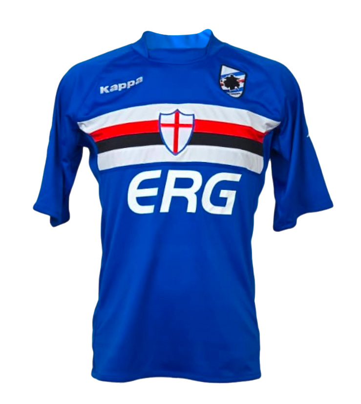 Maglia Sampdoria Home della stagione 2008/2009, player issued relativa alla competizione di Serie A e preparata per Antonio Cassano. La divisa presenta il classico colore blu con la storica banda orizzontale bianca, rossa e nera sul petto, completata dallo scudo di San Giorgio e dallo stemma ufficiale del club. Lo sponsor tecnico Kappa accompagna lo sponsor commerciale ERG, protagonista al centro del fronte. Sul retro è applicato il nameset Cassano con numero 99, simbolo di una delle stagioni più iconiche dell’attaccante barese in maglia blucerchiata. La versione Player Issued si distingue per il taglio aderente e i dettagli professionali, rendendo questo capo un autentico pezzo da collezione legato a uno dei periodi più rappresentativi della Sampdoria moderna.