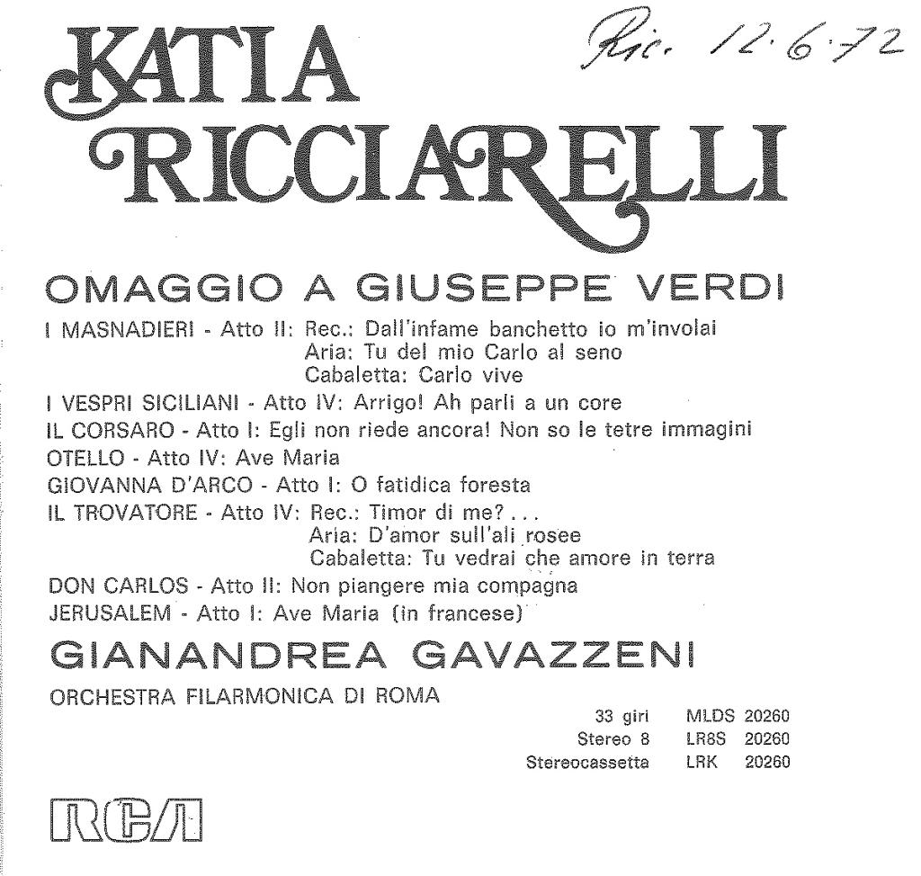 Sul retro compaiono le note editoriali e la discografia, con data “12.6.72” annotata in alto a destra.