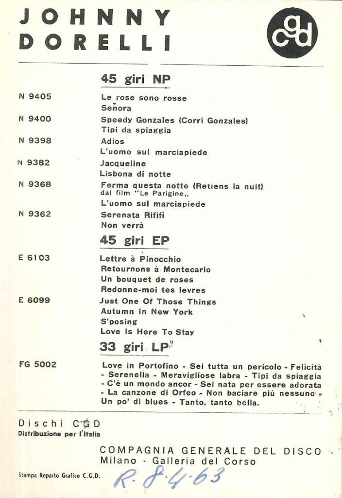 Sul fronte è presente un ritratto del cantante, realizzato in stile fotografico tipico dell’epoca, mentre sul retro compaiono i principali titoli del suo repertorio discografico.