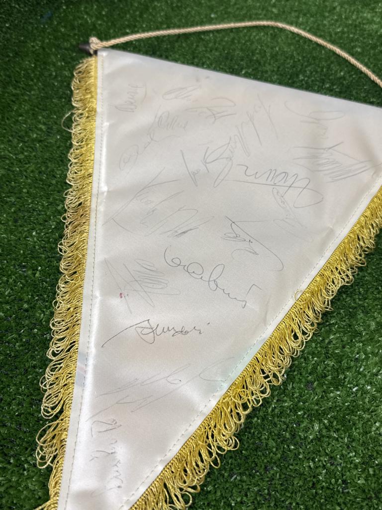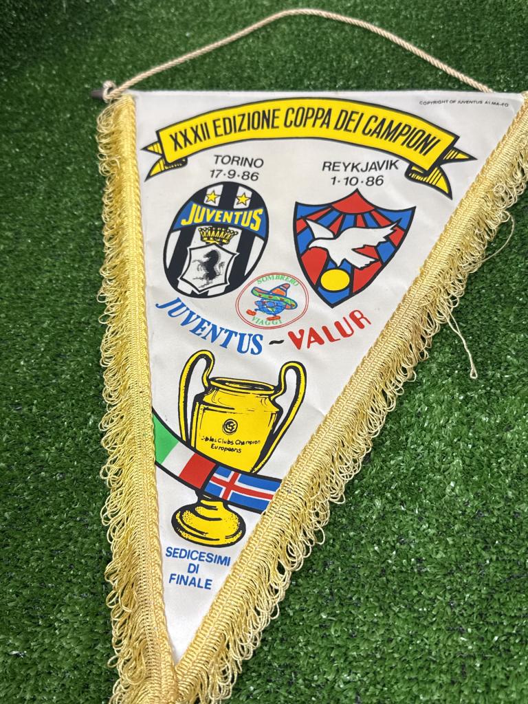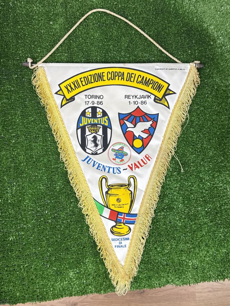 Autografi di squadra Juventus su gagliardetto commemorativo della XXXII edizione della Coppa dei Campioni, realizzato in occasione del confronto Juventus–Valur del 1986.
